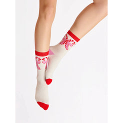 Add a sweet touch to your holiday wardrobe with the Candy Cane Bow Socks. These ivory socks are topped with a festive red cuff and toe, plus an adorable candy cane bow design in red and pink. A cozy and cheerful upgrade to your winter basics, they're perfect for lounging, gifting, or showing off during festive get-togethers. Soft, stretchy, and full of personality—these socks are a treat for your feet!