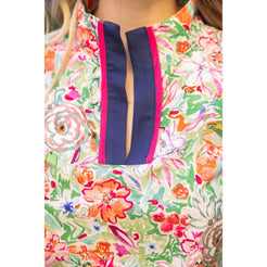 Embrace effortless spring style with this charming floral print top. The split neckline with contrast trim adds a sop...