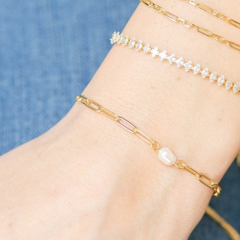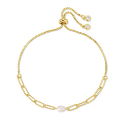 Elevate your wristwear with our stunning 18k Gold Plated Delicate Link Chain Pearl Pulley Bracelet. Designed for wome...