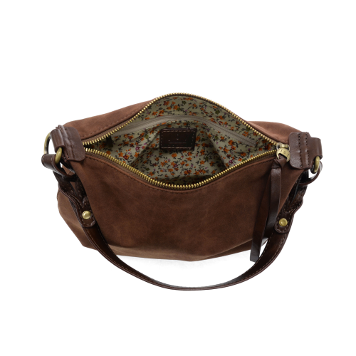 Smooth and supple vegan suede feels soft to the touch in this versatile crossbody style. Featuring a top zip closure accented by our signature logo zip pull, this versatile bag comes with two separate and removable shoulder straps, a short shoulder strap accented with artisanal braided details to give your look a touch of boho luxe style, or a longer, adjustable and removable shoulder strap to wear as a crossbody.