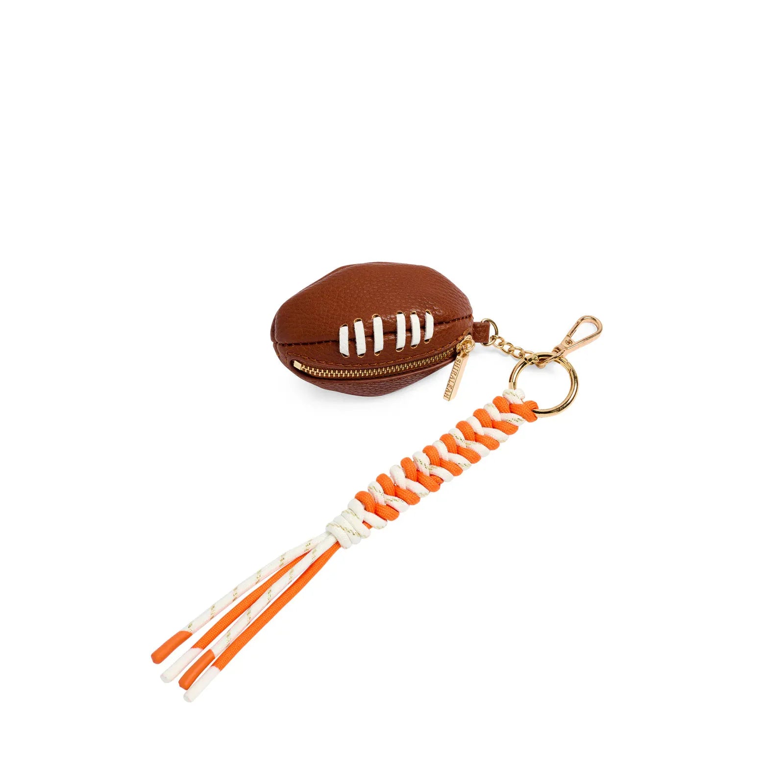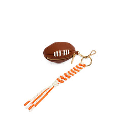 Show your team spirit with the Football Bag Charm/Key Ring – the ultimate sporty-chic accessory for game day and beyond. Shaped like a mini football, this faux-leather charm features a top zip closure to hold small essentials like coins or earbuds. It comes complete with a key ring and clasp hook, making it easy to attach to your favorite bag, belt loop, or keys. Finished with a braided tassel in your team’s colors, it's a playful nod to your football fandom.