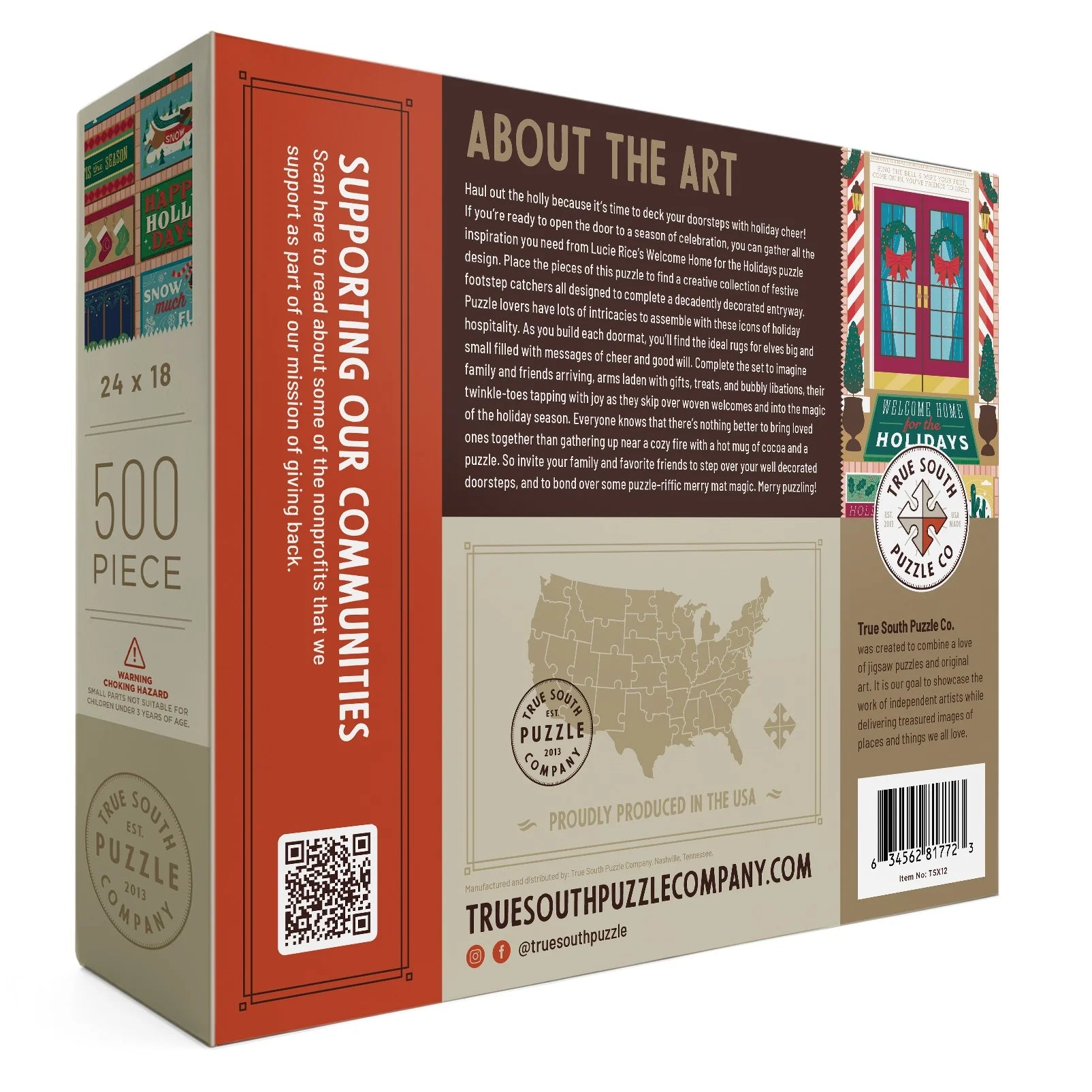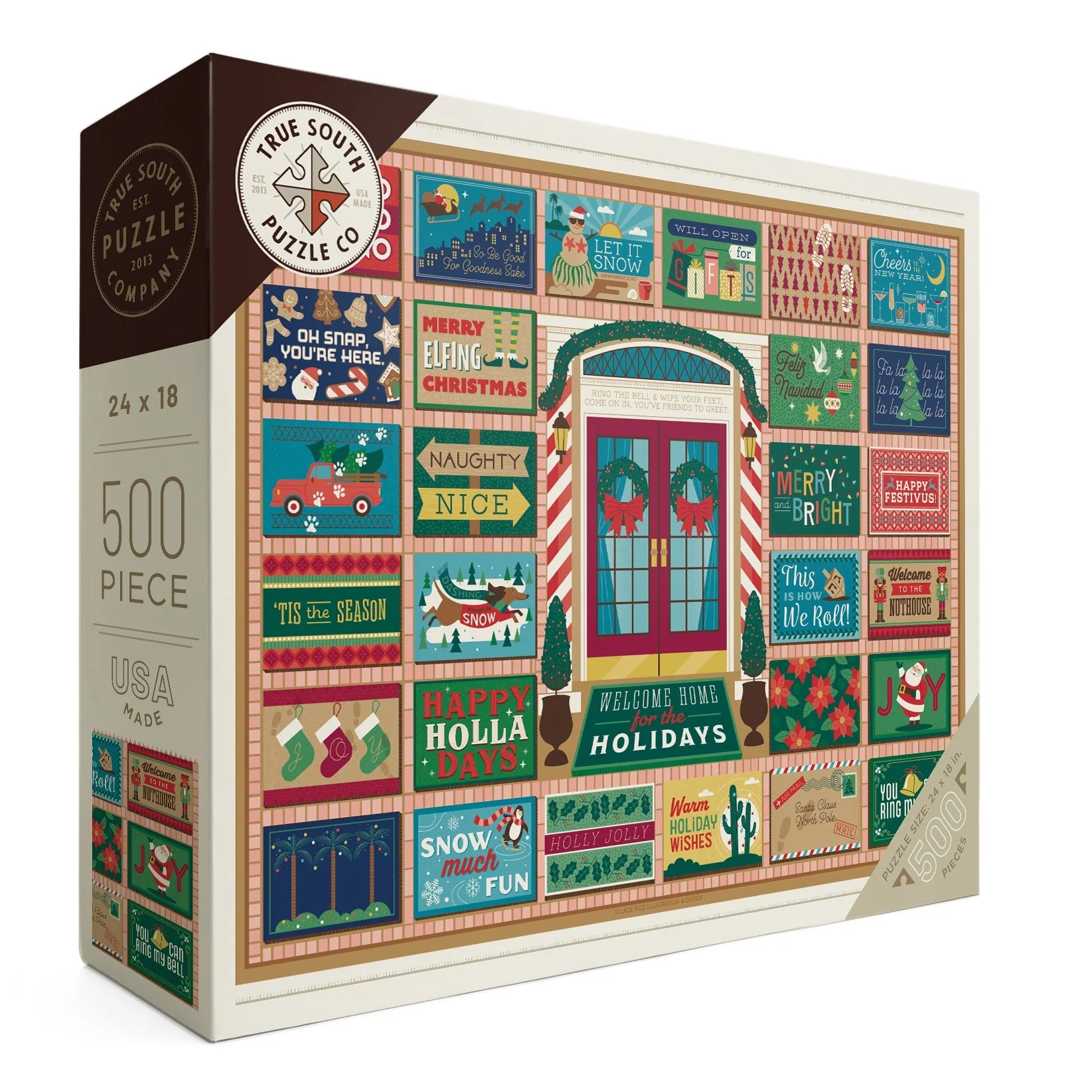 Puzzle lovers can celebrate the season from the comfort of home with Lucie Rice’s festive tribute to holiday hospitality. Bursting with cheerful doormats and merry details, this welcome home for the holidays puzzle is sure to warm up your winter table.