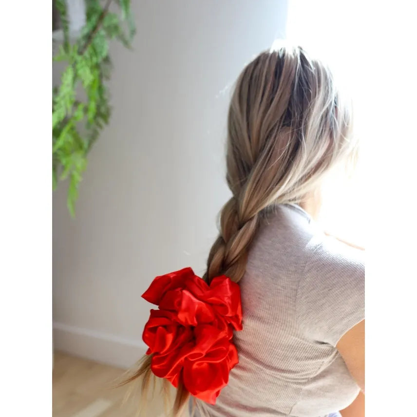 the bigger the better. take your everyday scrunchies and make them 5x the size for the most feminine statement piece. this chiffon lightweight material wraps around any hair length with the exclusive kaxi tag added on.
