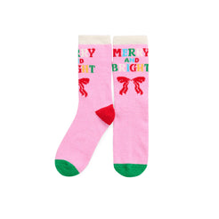 Spread some serious cheer from head to toe with our "Merry & Bright" Socks. These cozy pink socks are decked out with festive red bows and a colorful “Merry and Bright” message across the top. Green toes, red heels, and a soft cream cuff complete the jolly holiday look. Made from ultra-plush material, they're perfect for lounging in seasonal style.