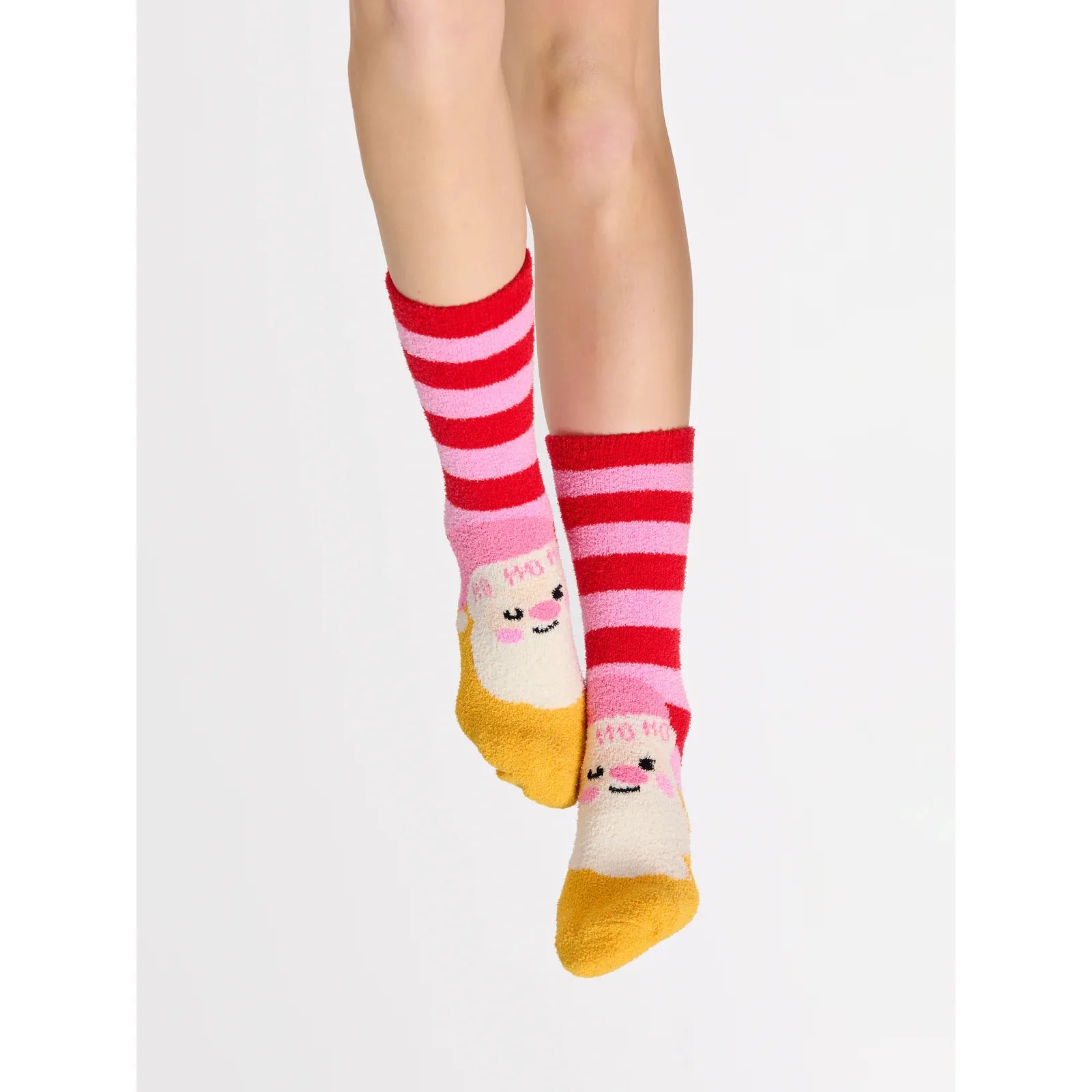 Get into the holiday spirit from the toes up with these cheerful Santa Socks. Featuring jolly Santa faces at the toes and bold red-and-pink stripes up the calf, these socks are pure festive fun. A cozy yellow heel and toe add a warm pop of contrast, making these socks as bright as the season. Whether you’re wrapping gifts or sipping cocoa, these fuzzy socks will keep you comfy and smiling.