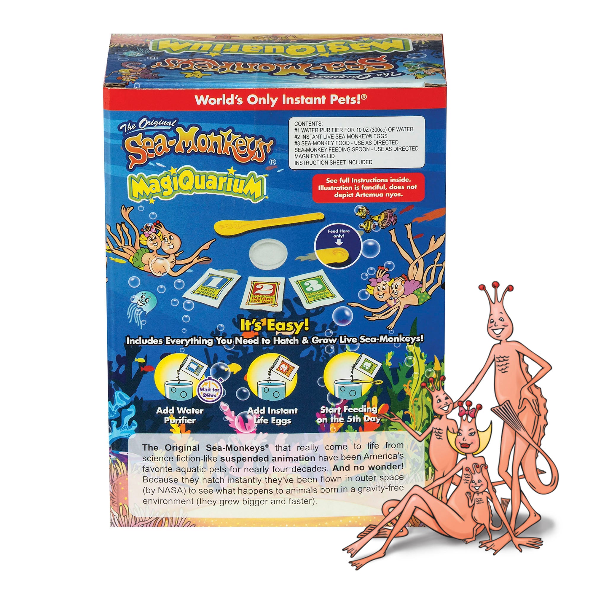 The original world’s easiest to care for, no-mess pet • Watch your Sea-Monkeys light up in the dark for up to 6 hours with the magical mystery light—no batteries or electricity needed! • 3 easy steps to create instant life! • Includes water purifier, instant live eggs, Sea-Monkeys food, feeding spoon, mystery light, and instructions