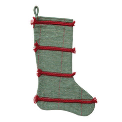 Elevate your holiday décor with this 20" woven stocking crafted from a recycled blend. Featuring a charming green and red color scheme, braided embroidery, and a sophisticated grid pattern, it adds a festive yet refined touch to any mantle. The delicate fringe detail completes the look, making this stocking both eco-conscious and stylish for the season.