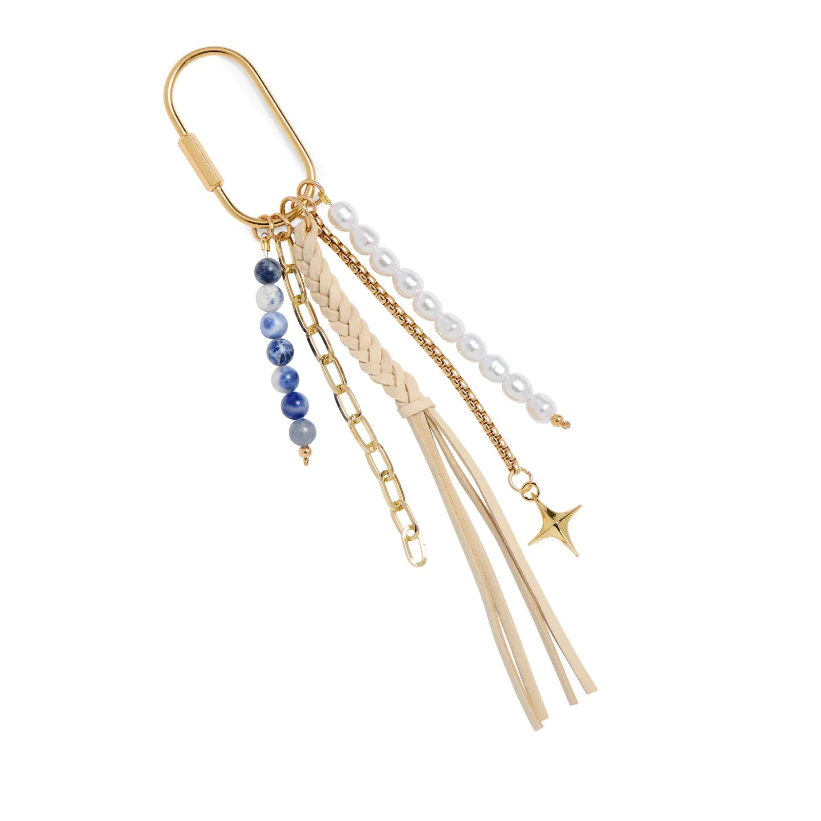 Add a playful twist to your everyday tote with our Tassel Bag Charm/Key Ring. This eclectic accent features a mix of textures, including faux suede fringe, glossy pearls, stone beads, and polished gold-tone chains. The oversized clasp makes it easy to clip onto your favorite bag or keychain for instant flair. Available in a variety of colors, it’s the perfect finishing touch for personalizing your accessories.