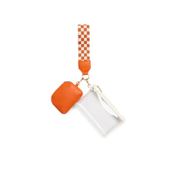 The Taylor Mini Wristlet is your new go-to for keeping essentials close without sacrificing style. This compact cutie features two interchangeable pouches—one sleek and solid, the other clear—attached to a wide printed wrist strap that brings all the Game Day vibes. Crafted from durable PU and transparent PU, it’s perfect for stadium regulations and statement looks. Just clip it on, load it up, and let your hands stay free while you cheer, snack, or snap pics.